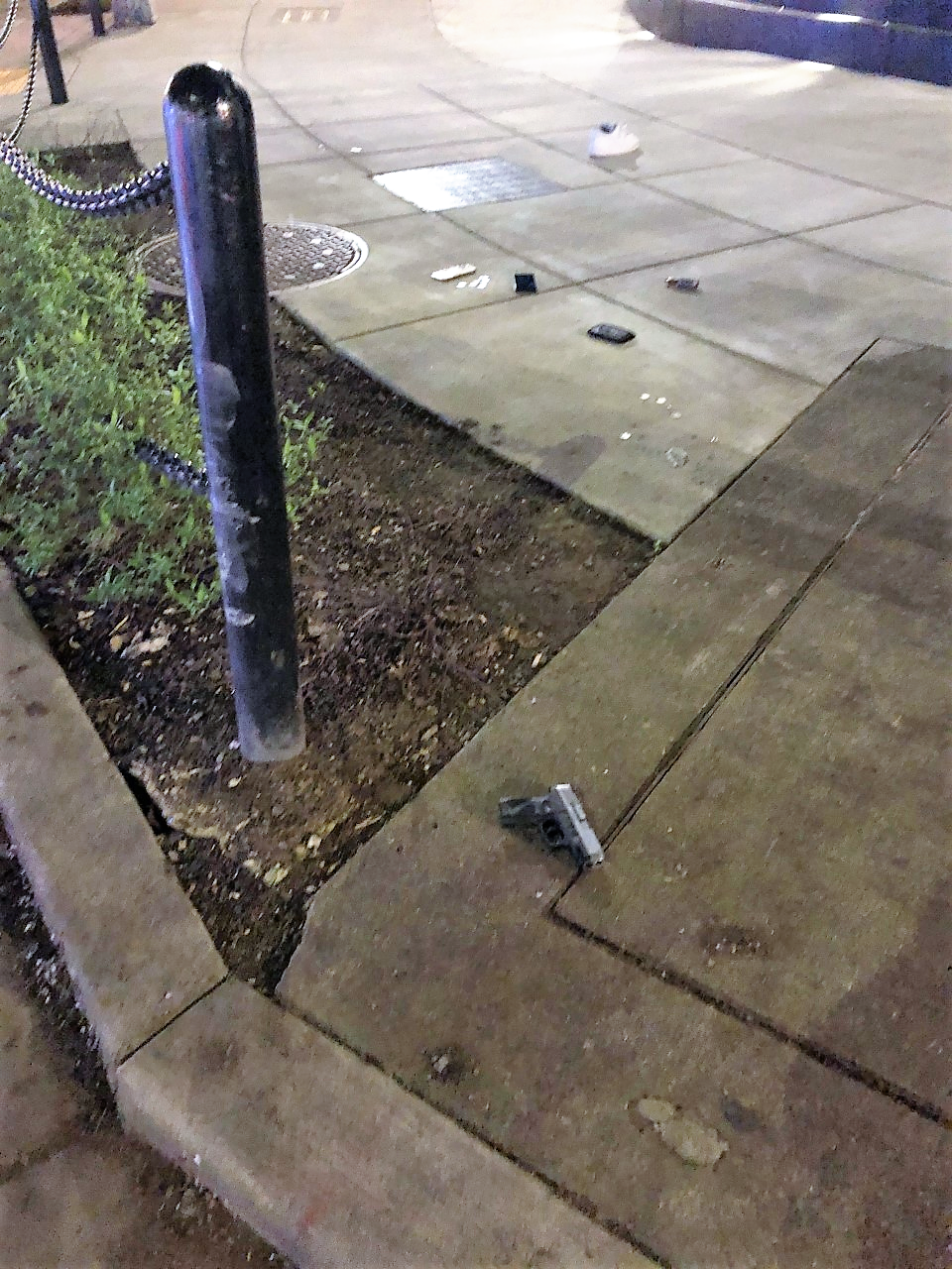 On Saturday, April 29, 2023 at 1:12a.m., Central Precinct and Focused Intervention Team officers responded to a report of a car, stolen at gunpoint in Vancouver, Washington, being tracked by GPS to the area of Southeast 5th Avenue and Southwest Hall Street. Officers saw three suspects running away from the stolen car and attempted to detain them. Despite police telling them to stop, they continued running away. One suspect tripped and a gun fell out of his pocket onto the ground. Officers took him into custody. The other two suspects were contained in the area and arrested a few blocks away.