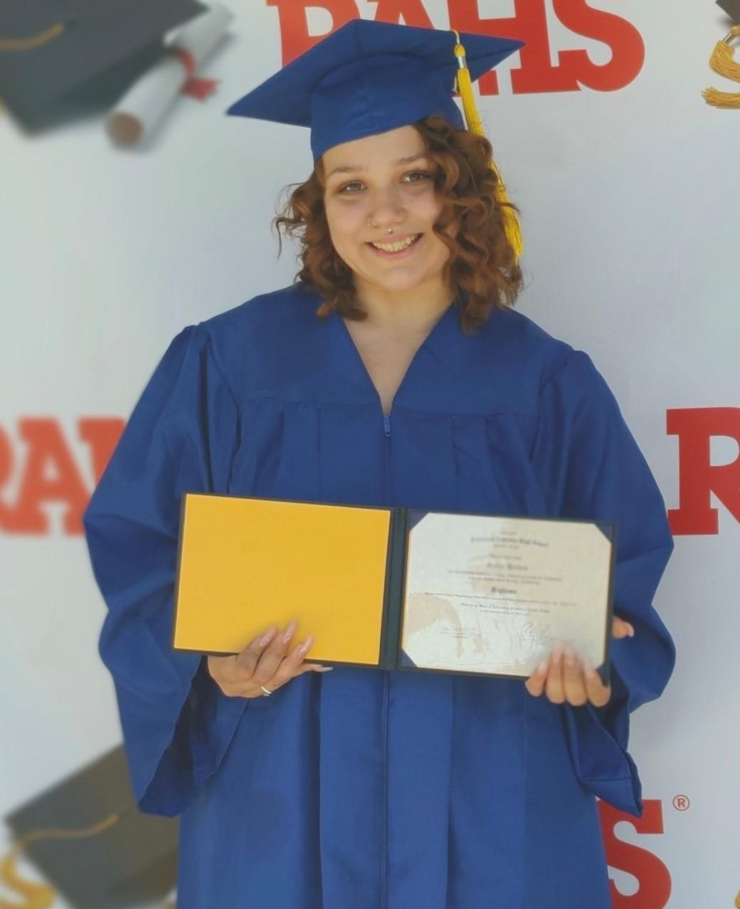 Photo description: Rylee Hatlen stands in a cap and gown at graduation.