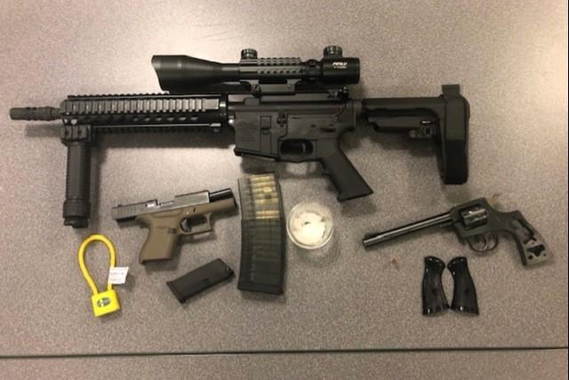 -Three guns displayed on a table, black AR15 rifle with scope, vertical foregrip, and clear large capacity magazine with visible ammunition, black over tan semiautomatic pistol with magazine, and .22 caliber revolver with detached grip