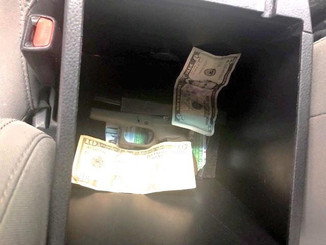 -Semiautomatic pistol in console storage, next to cash