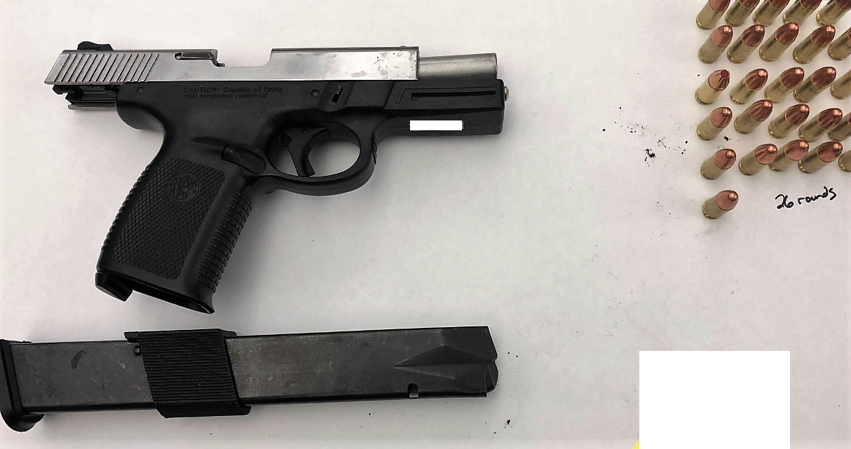 photo description: displayed on a white sheet of paper is a black semiautomatic handgun with chrome slide locked in the rear position, an extended capacity magazine, and 26 rounds of brass and copper colored ammunition