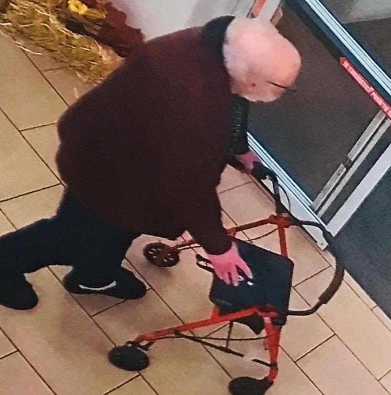 William is a white male, 5’8, 260 pounds. He was last seen wearing a dark red sweater jacket, green t-shirt, black sweatpants and black velcro shoes. He was pushing a red seated walker with a hand brake. William wears glasses, has a white mustache, beard and a mole on his forehead.