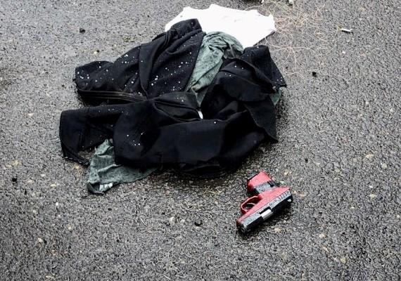 Photo description: a red and black semiautomatic handgun lays on the street near a pile of clothing