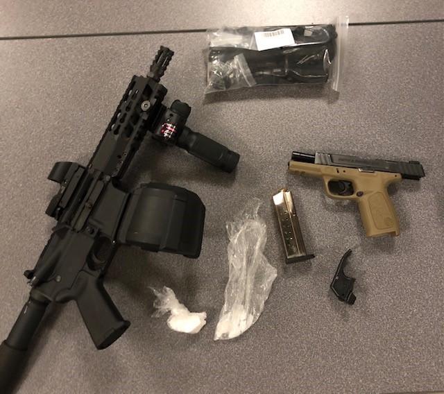 Photo description: A tactical rifle with drum magazine, and a tan pistol with black slide, 2 baggies with drugs inside