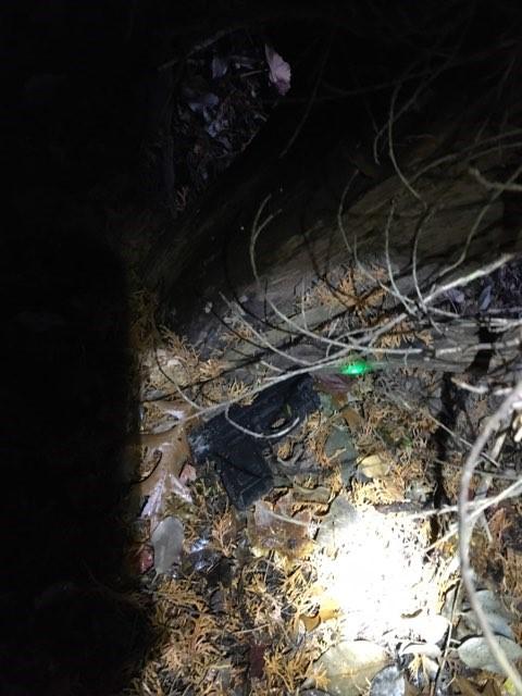 A plan to contact the suspect was made and a custody team moved to contact him. During the contact, officers could see a green laser beam shining in the bushes near the suspect. The suspect was taken into custody without any force being used. Offices located a black, semi-automatic pistol with a green laser attached to it. A loaded, high-capacity magazine was located nearby.