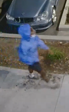 Suspect #4 appears to be a Black male, is wearing a blue hoodie, dark-colored shorts and light-colored shoes.