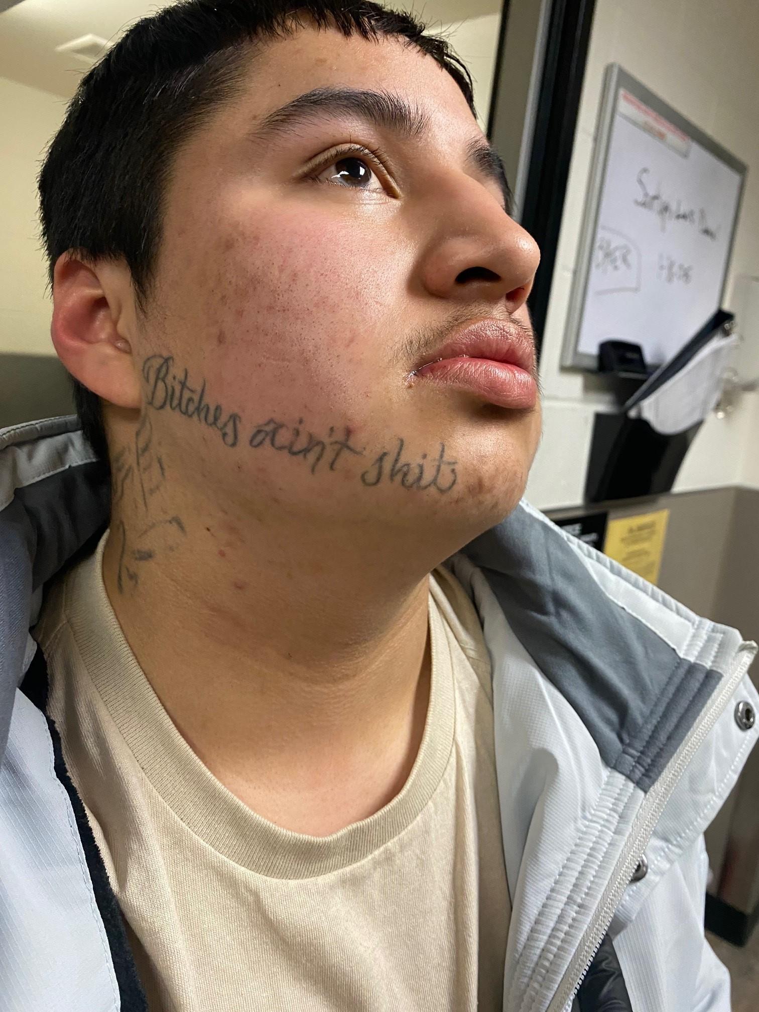 Louis Santiago is described as an adult male in his late teens. He stands approximately 5’3” tall and weighs 200 lbs. Santiago has medium length black hair, brown eyes, and the beginnings of a mustache. There is also a unique tattoo on Santiago’s jawline that reads “Bitches ain’t shit”.