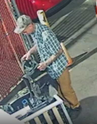 The suspect in this assault is described as a 22 to 29-year-old white male standing about 6’3” tall. He appears to have a slim build, weighing approximately 160 lbs. There are visible tattoos from the suspect’s left hand, extending to his elbow. He was last seen wearing the pictured blue-plaid shirt, beige pants, camo baseball cap, and black shoes. The suspect left the scene shortly after the assault pulling the pictured canvas wagon.