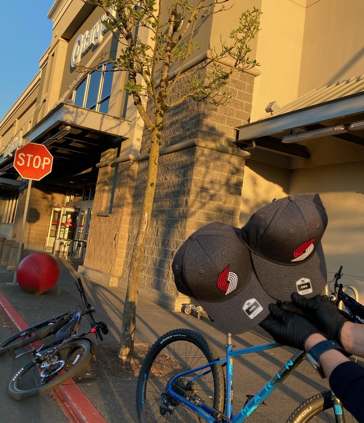 Photo descriptions: A bicycle officer searches a suspect, in handcuffs MCSO and Portland vehicles with police lights flashing parked in front of a Safeway Two Trailblazers ballcaps held up in front of Target Roll call at East Precinct with PPB and MCSO A suspect sits on the bumper of a police vehicle as a police officer looks on A suspect in handcuffs in front of Fred Meyer with recovered stolen items on the hood of a police vehicle, including hair dye, jewelry, and fashion items A suspect in handcuffs seated on a curb in front of an MCSO vehicle A suspect being arrested in front of Target A theft suspect in handcuffs being escorted by officers.