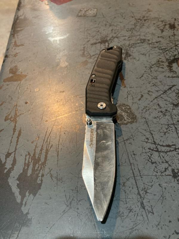 4-Open folding knife, silver colored blade with black handle, with broken blade tip