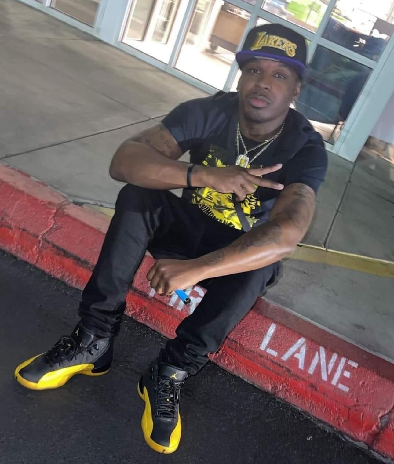 Anthony Bell sitting on a curb wearing black and yellow clothing