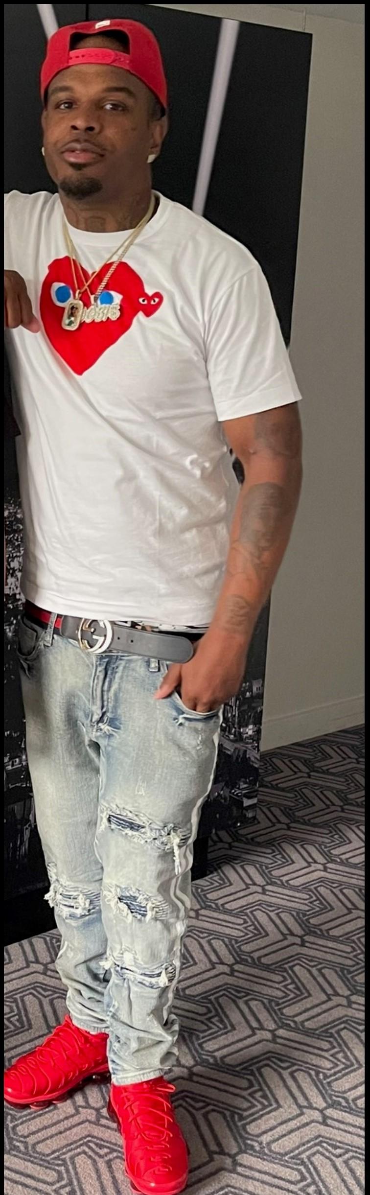 Anthony standing wearing red hat, white shirt, faded blue jeans, red shoes
